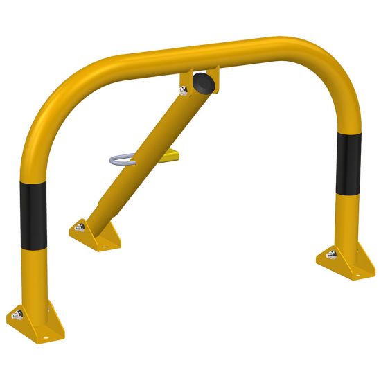 Blocator rezervare parcare tip arc Poarta Midi model BPP-02, 600x400 mm, piston, galben, lacat, dibluri, holsuruburi este un sistem folosit pentru blocarea accesului pe locurilor de parcare.