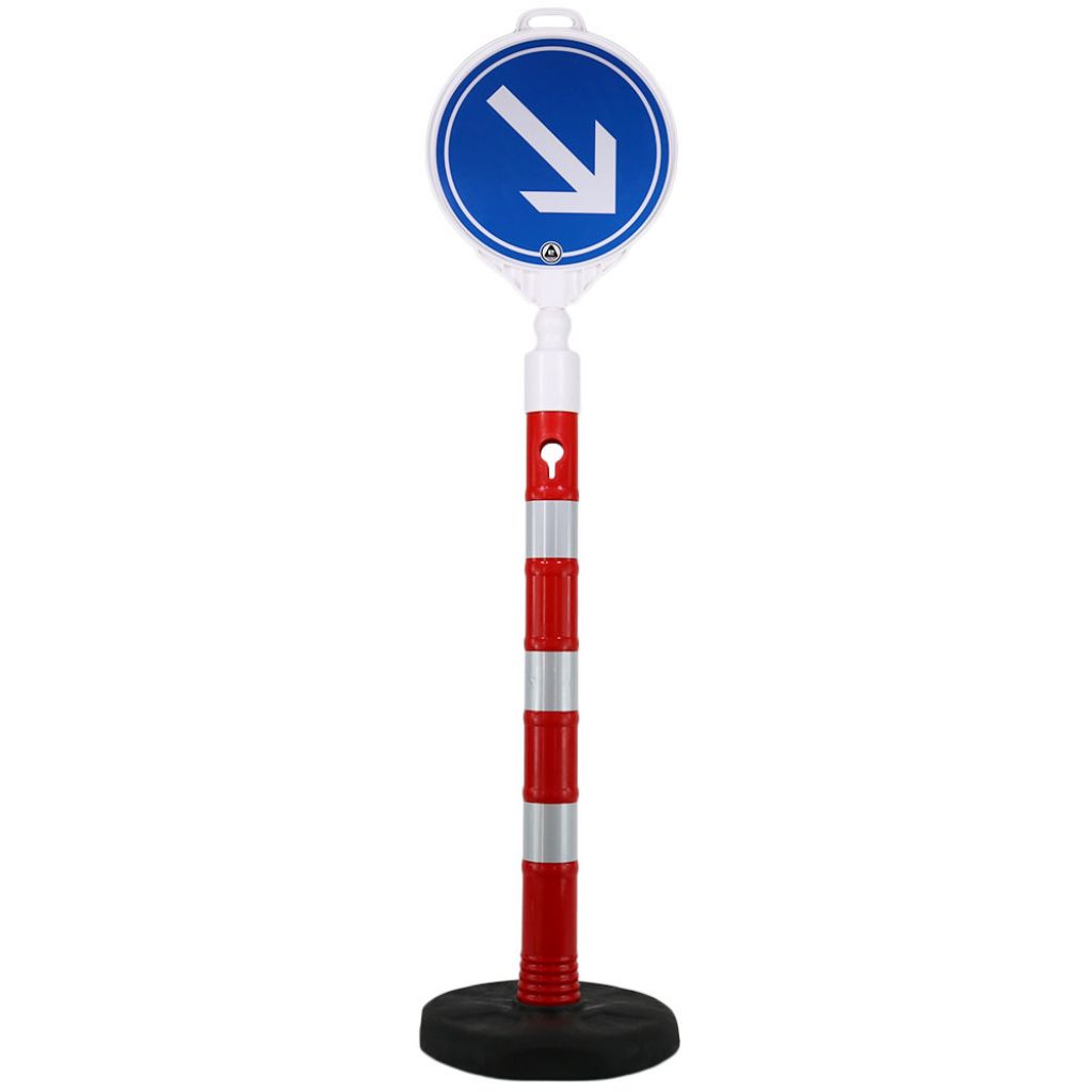 Set format din un stalp cu inaltimea de 1100 mm, o baza cu greutatea de 6.5 kg si un indicator din plastic pentru ocolire pe partea dreapta.